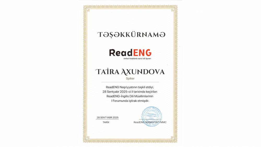 Bakı Gənclər Mərkəzində ReadENG nəşriyyatının təşkilatçılığı ilə ölkəmizdə ilk dəfə olaraq “ReadENG – İngilis dili müəllimlərinin I Forumu” keçirilib. Tədbirdə digər rəsmi şəxslərlə yanaşı Dövlət Gömrük Komitəsinin Akademiyasının “Hüquq və humanitar elmlər” kafedrasının ingilis dili müəllimi Tairə Axundova da iştirak edib. “Xarici dilin tədrisində çağırışlar” mövzusuna həsr olunan forum ingilis dili müəllimləri üçün peşəkar inkişaf, təcrübə mübadiləsi və innovativ yanaşmaların paylaşılması baxımından mühüm platforma olub.
