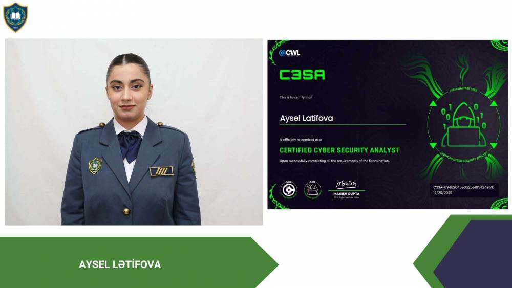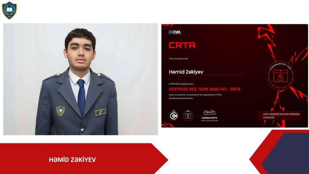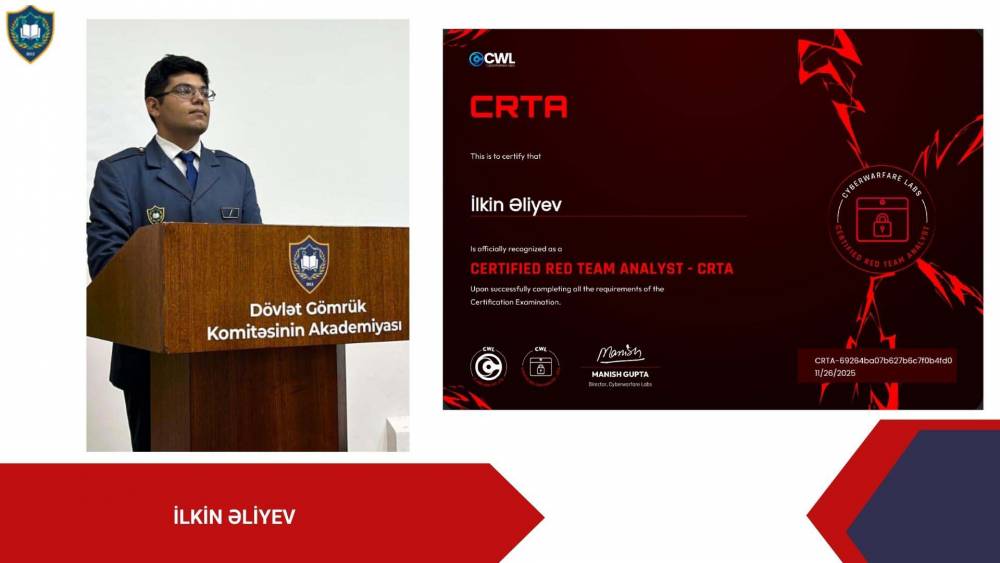 Dövlət Gömrük Komitəsinin Akademiyasının (DGKA) tələbələri İT sahəsi üzrə növbəti beynəlxalq sertifikatlara layiq görülüblər. Belə ki, Akademiyanın “İnformasiya təhlükəsizliyi” ixtisasının tələbələri Həmid Zəkiyev və İlkin Əliyev dünyanın beynəlxalq səviyyədə tanınan CRTA (Certified Red Team Analyst) sertifikatını, Aysel Lətifova Cyber Security Analyst (C3SA) sertifikatını, Gülyaz İsmayılzadə eJPT (Junior Penetration Tester) və eWPTX (Web Application Penetration Tester eXtreme) sertifikatlarını, Fəxrəddin Məşədizadə CCNA (Cisco Certified Network Associate) sertifikatını qazanıblar.
